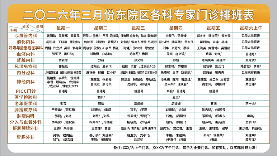 东院区周一至周六上午门诊专家排班