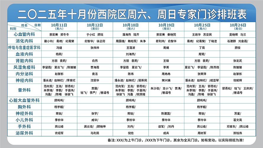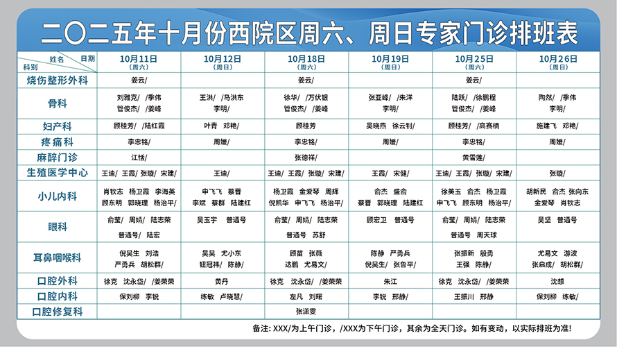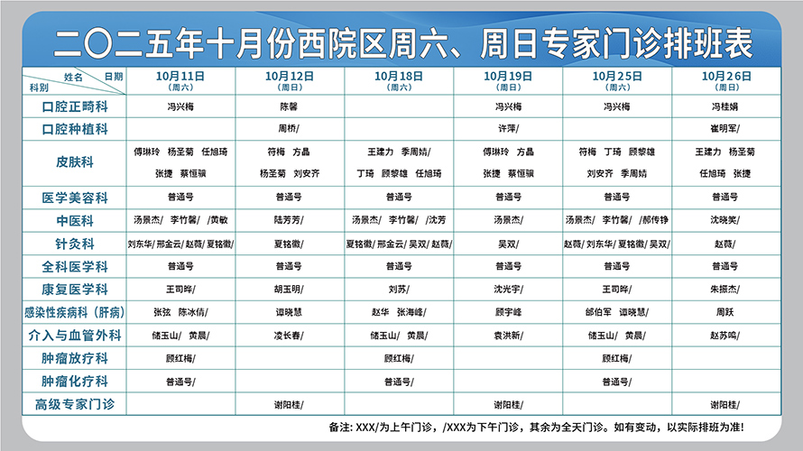 二○二五年十月份西院区周六、周日专家门诊排班表