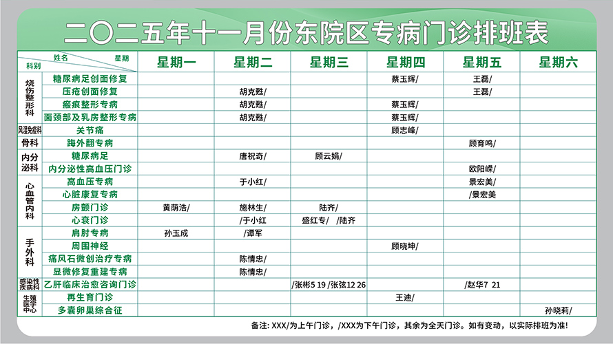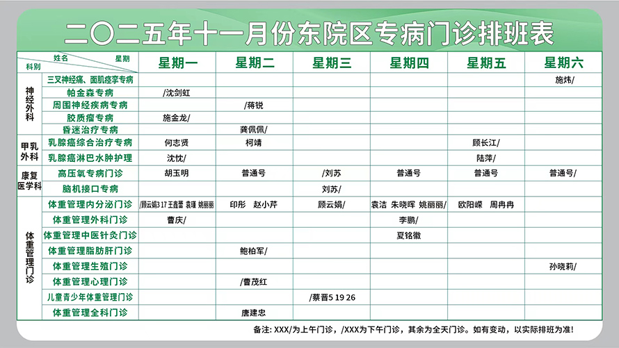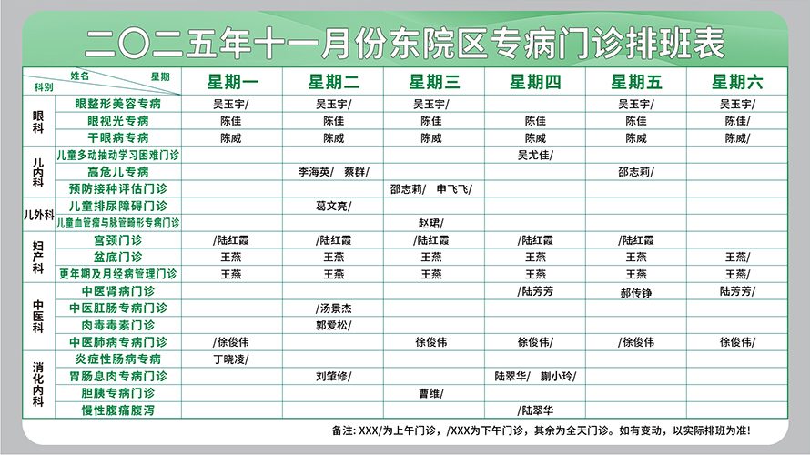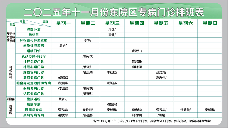 二○二五年十一月份东院区专病门诊排班表