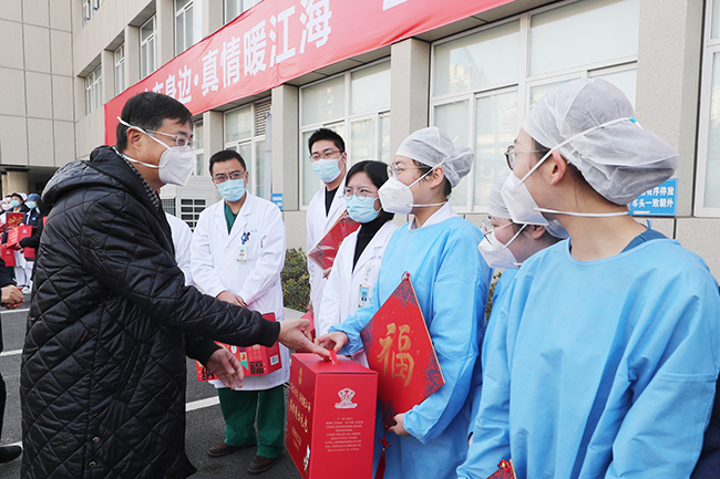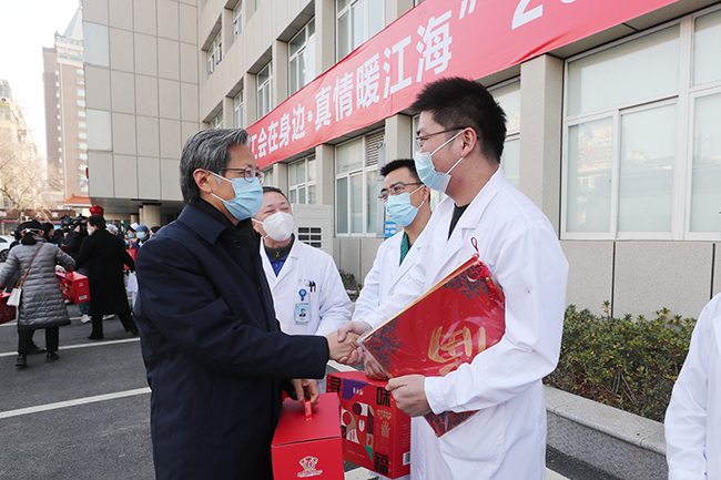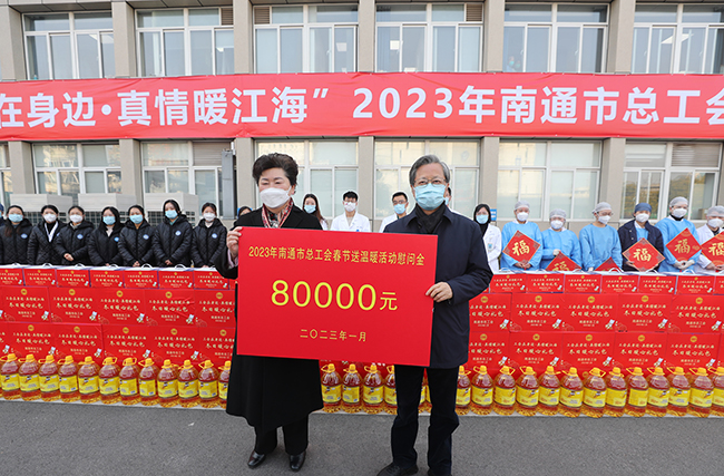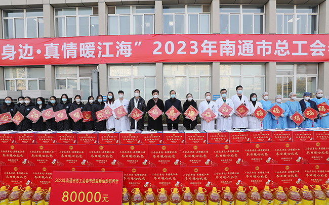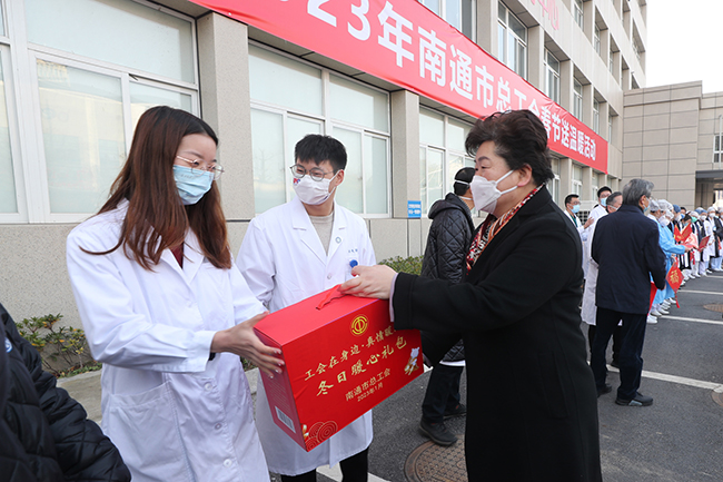 1月18日,南通市人大常委会副主任、市总工会主席葛玉琴,市总工会党组书记、副主席葛志娟一行,来到我院慰问坚守在新冠感染救助一线的医护人员,为他们送上工会冬日暖心礼包和慰问金。院党委书记高建林,党委委员、副院长马强陪同慰问。 葛玉琴在慰问中表示,长期以来,我院作为省级综合类医疗中心,全院医务人员始终坚守岗位,坚持人民至上、生命至上,体现了无私奉献、敢于担当的大无畏精神,市委市政府和市总工会对我院医务工作者的辛勤付出表示衷心的感谢。当前是救治工作最紧张最吃劲的时刻,医务人员要咬紧牙关再坚持,把当前阶段工作重心转移到保健康、防重症上来,千方百计做好急诊患者就医、重症患者救治,最大程度保护市民群众的生命安全和身体健康。 来自我院急诊、呼吸与危重症医学科、感染性疾病科等一线医护人员及相关职能部门负责人现场参加了慰问活动。 (供稿:工会)