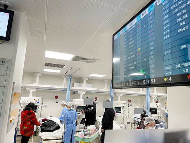 “准备用物、清洗鼻腔、自鼻孔插入胃管、抽吸液体......”进入急诊抢救室大厅,映入眼帘的便是穿着蓝色隔离服的护士正在为一名肠梗阻的患者进行胃肠减压。一系列操作结束之后,她交代完注意事项,又一路小跑去了下一位患者床旁。大厅内的医护人员皆是步履匆匆,“目前急诊抢救室红黄区均已满员,部分患者临时安置在急诊抢救室大厅内。”急诊抢救室护士长陈天喜说道。“忙碌是常态,即使是春节期间,急诊抢救室24小时内最高入抢人数超过100人。”