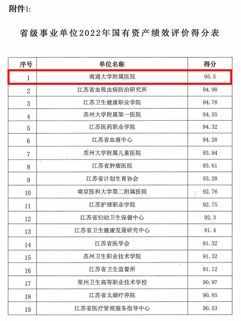 近日,江苏省卫生健康委发布了《关于反馈2022年国有资产管理绩效评价情况并做好整改落实工作的通知》,我院2022年国有资产管理绩效评价获得95.5分,在省卫健委29家直属单位中排列第一。我院将根据此次评价结果,认真梳理总结,查漏补缺,夯实基础,切实做到以评促建、以评促管,进一步提高国有资产管理水平。