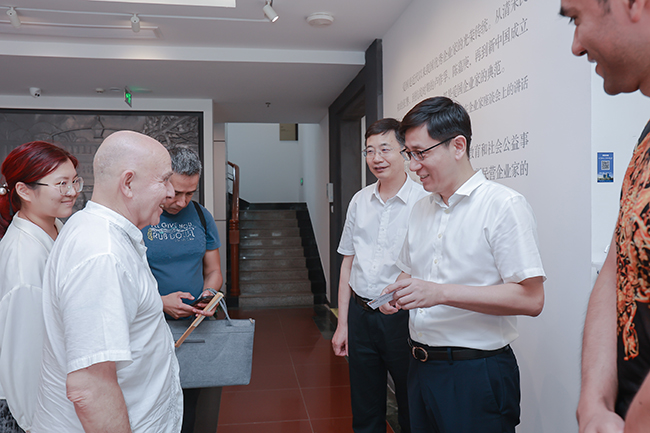 7月9日下午,墨西哥工农革命联合会(CROC)原公共政策与国际部书记德·瓦拉·何塞(DEL VALLE JOSE)先生率访华团来到我院文博中心参观考察,省总工会党组成员、副主席高立波,市人大常委会副主任、市总工会主席葛玉琴,市总工会党组成员、副主席吕建峰,我院党委副书记、院长施炜,党委委员、副院长马强陪同参观。 院工会主席、文博中心主任倪歌用通俗易懂的语言向外宾们介绍了文博中心的功能布局及职工活动的开展情况。 随后访华团一行来到职工活动室,在南通茶文化研究会会长郭树红的带领下赏茶、泡茶,体验优雅的中国茶文化;聆听古琴艺术梅庵琴派南通市级代表性传承人倪歌弹奏古琴,与中国最古老的弦乐器对话。韬奋书房里,南通青年书法家协会副会长古剑和青年书法家朱欢笑正带领书法爱好者们泼墨挥毫,并向墨西哥友人送上了刚刚完成创作的书画折扇。访华团一行还参观了院史馆与眼科博物馆。 今年是中国和墨西哥迈入第二个50年的开启之年,也是两国建立全面战略伙伴关系10周年。何塞先生一行表示非常感谢院方的安排,听千年古琴,品中国茶香,闻墨宝书香,让他们感受到了中华优秀传统文化的独特魅力,也在通大附院百十余年的发展足迹和中国眼科事业发展的历史长河中看到医者的力量和中国的力量。 (供稿:朱志红)