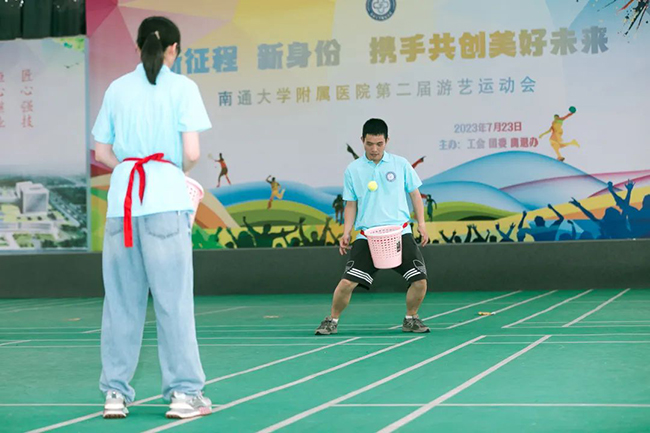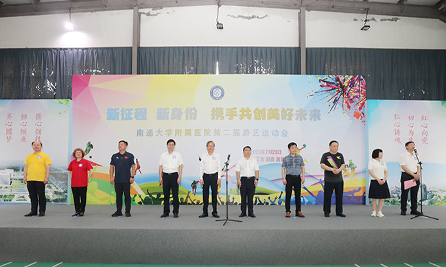 7月23日,以“新征程 新身份 携手共创美好未来”为主题的我院第二届游艺运动会在南通大学启秀校区举行。南通市总工会党组成员、副主席成飞,直属工作部部长杜正芳应邀出席开幕式。在通院领导高建林、施炜、邢晓源、马强、赵建美、陆玉华及南通大学体育科学学院副院长於世海等参加了活动。
