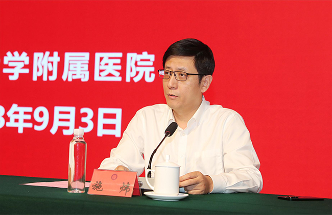 施炜代表院党委向全院干部职工发出号召,站在新发展阶段,面临新发展机遇,锚定新发展目标,需要全院上下怀揣“三大梦想”,坚持“一个目标”,建设成为省内顶尖、国内一流,医、教、研、管四核驱动的高水平研究型医院;突出“两个中心”,即医疗服务和员工福祉的中心地位;筑牢“三个基础”,即人才、团队、学科基础;打造“四项支撑”,即质量、技术、服务和运营支撑;秉持“五种理念”,即务实、特色、创新、同治、共享理念;实施“六项工程”,即学科登峰工程、人才辈出工程、技术引领工程、科创突破工程、精品服务工程和幸福家庭工程。
