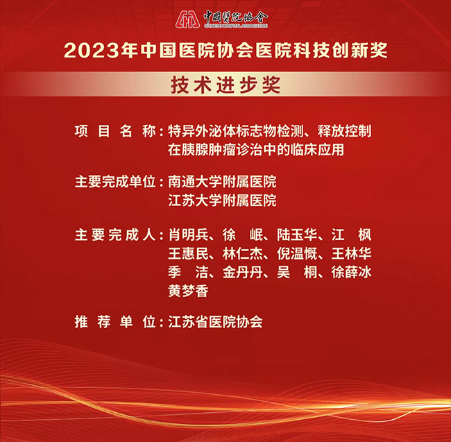 10月28日上午,2023年中国医院协会医院科技创新奖颁奖大会在湖南长沙举行,我院肖明兵教授团队荣获“2023年中国医院协会医院科技创新奖-技术进步奖”,项目主要完成人有:肖明兵、徐岷、陆玉华、江枫、王惠民、林仁杰、倪温慨、王林华、季洁、金丹丹、吴桐、徐薛冰、黄梦香。 中国医院协会医院科技创新奖是经国家科学技术奖励工作办公室批准于2009年设立的全国医院行业科学技术奖项,目的是为了贯彻落实党中央关于全面推进健康中国建设和创新驱动战略的决策部署,激励广大会员单位在医药卫生科技研发及管理领域的探索与创新,推动医院科研和管理水平的提升,促进卫生健康科技成果向临床应用转化。本年度经各省级推荐单位筛选、中国医院协会组织专家初审后,共有203个推荐项目通过形式审查,最终49个项目获奖,获奖率24.1%。其中,研发创新奖10项、技术进步奖29项和医院管理创新奖10项,不分等级。 肖明兵教授项目组在多项国自然及省民生重点研发计划资助下,全面研究分析了多类外泌体特异性标志物在胰腺肿瘤流行病学调查、早期诊断、术前评估、综合治疗、术后随访及预后判断中的价值及相关机制。通过探索旧药新用,首创性发现“依帕斯他”新功能,为胰腺肿瘤治疗提供了途径,促进了药物的应用创新。该成果的应用可提高胰腺肿瘤的早预防、早诊断及早治疗,从而达到“三早”的诊疗效果。项目的研究成果引起了国内专家及企业的高度关注,在多家医院及企业得到推广应用,取得了较好的社会效益和经济效益。 (供稿:科技处)