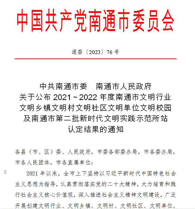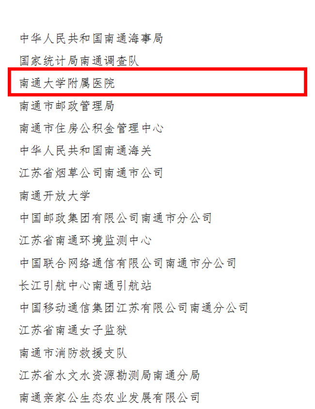 近日,中共南通市委、南通市人民政府联合发布《关于公布2021~2022年度南通市文明行业文明乡镇文明村文明社区文明单位文明校园及南通市第二批新时代文明实践示范所站认定结果的通知》,我院荣获2021~2022年度“南通市文明单位”称号。 近年来,我院坚持以习近平新时代中国特色社会主义思想为指导,全面贯彻党的二十大精神,始终把文明创建作为医院重点工作,大力弘扬“大医精诚,以宏慈善”的院训精神,通过开展志愿服务、创文宣传、环境卫生整治等各种形式的文明创建活动,加强了干部职工的文明素养,营造了良好的医疗环境,弘扬了社会主义核心价值观,提升了医院的整体形象和声誉。 随着医院第六次党代会的胜利召开和东院区启用在即,我院将以此获奖为契机,踔厉奋发、勇毅前行,培育精神文明新风尚,建设精神文明新高地,为全面建设“省内顶尖、国内一流,医、教、研、管四核驱动的的高水平研究型医院”作出更大的贡献。 (供稿:党委宣传部)