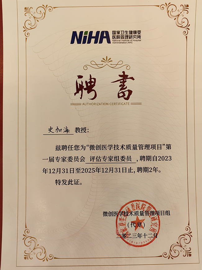 | 史加海教授受聘国家微创医学技术质量管理项目首届评估专家组委员 |