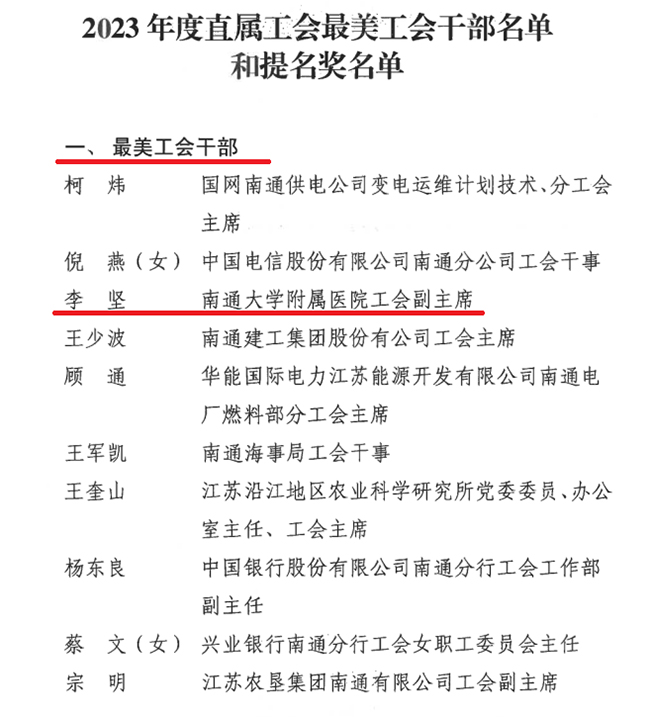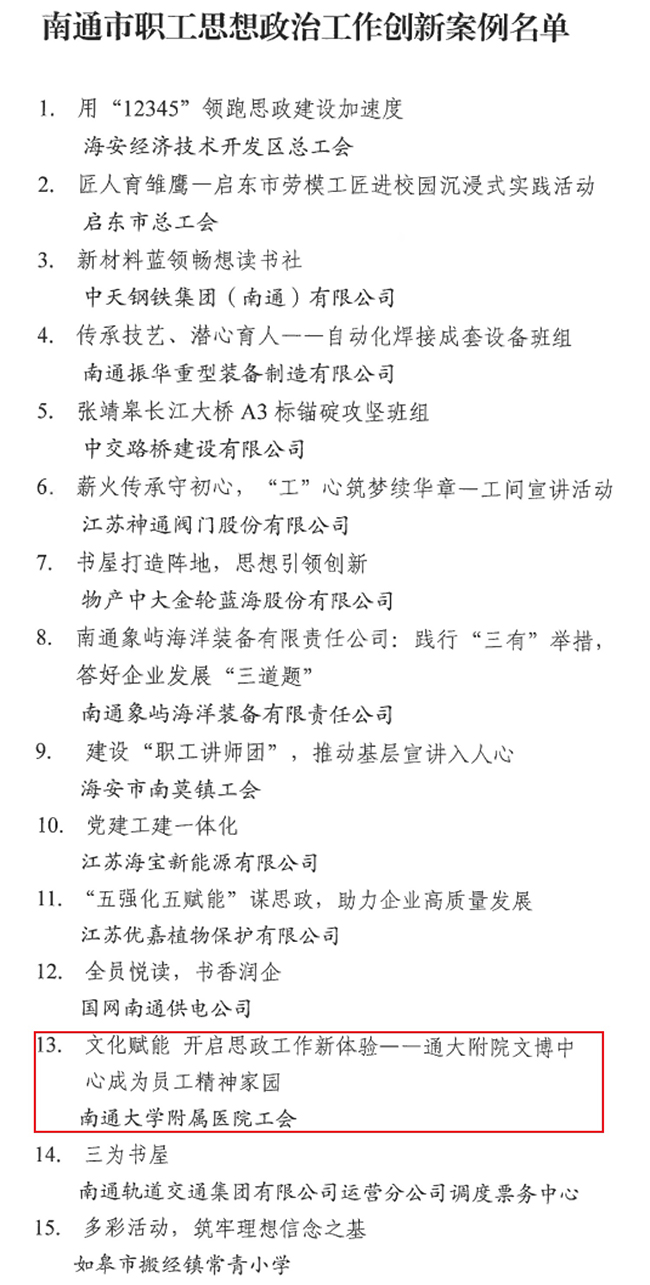 近日,南通市总工会发文公布了2023年度南通市总工会直属工会“双争”活动获奖名单,我院机关第二工会小组获模范职工小家称号,麻醉手术科朱琴获最美一线职工称号,工会李坚获最美工会干部称号。同期,院工会申报的“文化赋能,开启思政工作新体验——通大附院文博中心成为员工精神家园”案例入选南通市职工思想政治工作创新案例。 下一步,院工会将继续认真学习贯彻党的二十大精神、中国工会十八大精神,以习近平新时代中国特色社会主义思想为指导,紧紧围绕医院中心工作,坚持高站位思想引领、高质量建功立业、高品质服务职工、高水平自身建设,持续加强职工之家建设,有效发挥工会组织的桥梁纽带作用,以员工福祉为中心,持续打造员工立院“幸福工程”,团结带领广大职工为全面建设省内顶尖、国内一流,医、教、研、管四核驱动的高水平研究型医院贡献力量。 (供稿:朱志红)