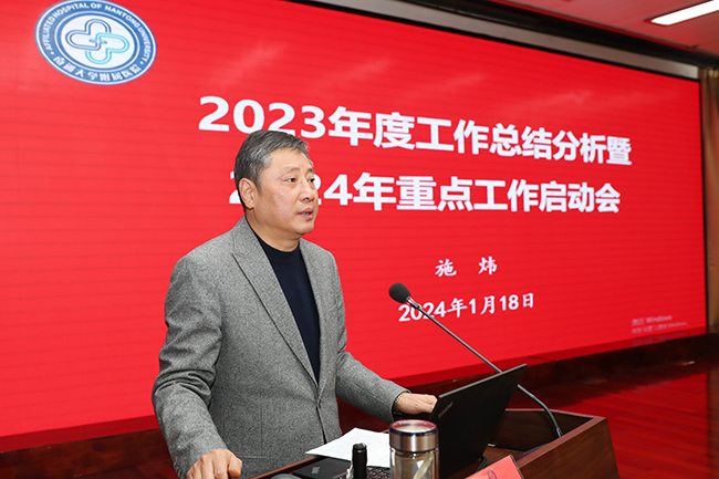 施炜从医疗质量、医保管理、科研教学、人才工作、经济运营、幸福家园等六个方面,采用大量详实的数据,以结果为导向,对医院2023年度工作进行了全面深入的总结分析;重点围绕医疗强院“提质工程”、科教兴院“强翼工程”、管理治院“智慧工程”、人才强院“荟萃工程”、员工立院“幸福工程”,以及东院区启用等方面全面布置了医院2024年重点工作。