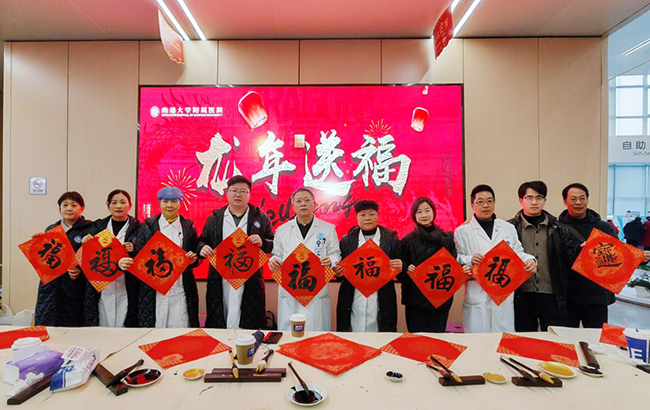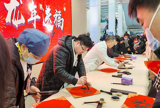 2月5日上午,院工会、离退办在门诊楼一楼大厅举办龙年送福字活动,为广大市民送上浓浓年味和龙年专属祝福。 门诊楼内,全国先进工作者、急诊医学科主任黄中伟携我院书法爱好者一行5人在现场为市民朋友们提笔挥毫,写福字,送祝福。有苍劲有力的福字,有金光灿灿的“黄金万两”和“招财进宝”,也有龙年特色的“龘”字。路过的患者、家属和医护人员纷纷排队领取祝福。此外还邀请了对书法感兴趣的小朋友们共同书写福字,现场其乐融融,为即将到来的龙年春节增添了浓浓年味。 迎春纳福送“福”字的暖心活动已延续六年,受到了广大市民的热烈欢迎。该活动既表达了通大附院对市民们的衷心祝福,也弘扬了传统书法艺术之美,成为院内的一道靓丽风景线。 (供稿:潘鹏)