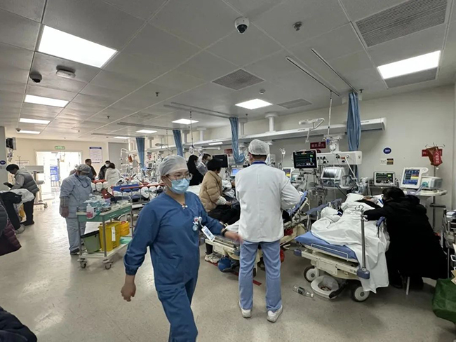 急诊抢救室 在万家灯火、团圆欢聚的春节期间,通大附院的急诊室却是一片忙碌景象。 此刻在急诊抢救室有55个病人,大部分是插管使用呼吸机的危重病人,患者主要是呼吸系统疾病,神经内科的患者也处于满床状态。此外,还有部分心内科的病人需要紧急救治。急诊抢救室已经处于满员状态,总值班和急诊的医务人员一直在想方设法调度床位,争取把患者收治进病区,空出更多床位。“算上夜休,我春节总共有三天的假期,节假日上班是我们急诊科的日常。”急诊抢救室当班的主管护师薛施霞表示。