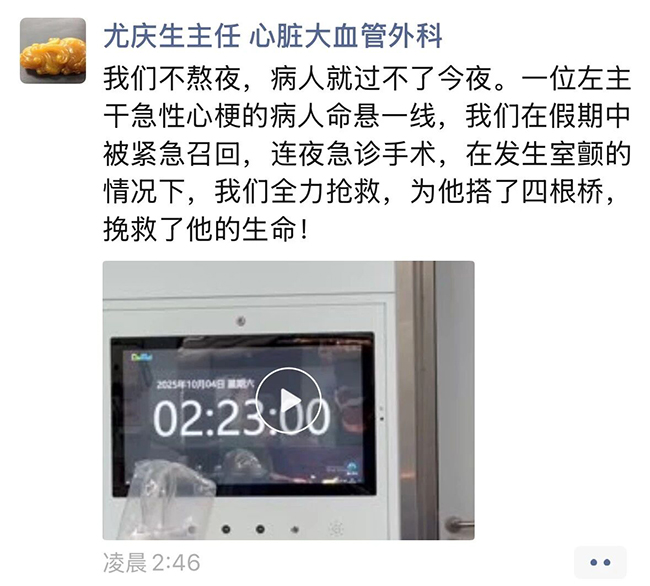 “我们今天晚上熬点夜,这个病人才能熬过今夜呀!”10月3日深夜,通大附院心脏大血管外科主任医师尤庆生教授在完成一例高难度心脏手术后感慨道。这个国庆假期,通大附院上演了一场与死神的赛跑。