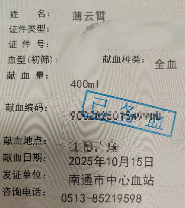 当晚,王阿姨联系上薄医生,他二话不说,陪她去血站办理互助献血手续。献血时,他没有犹豫:“从医学角度,我清楚这类手术的用血需求,所以直接选择了最大献血量——400毫升。”