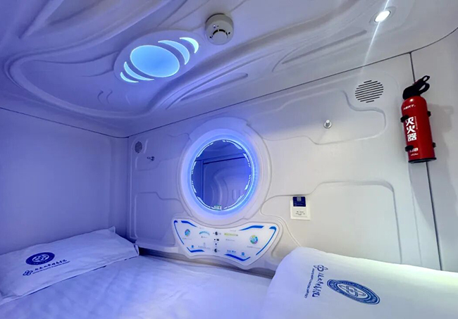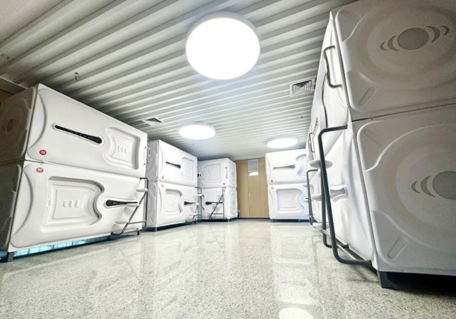 休息驿站内的“太空舱”内部空间设计合理,最大尺寸为长2.2米、宽0.9米、高1.6米。每个舱内被褥整洁,设施完善,配备了LED照明镜、阅读灯、USB充电口、换风循环系统及空气净化系统,充分考虑到使用者的舒适与便利。同时,为确保安全,舱内还安装了灭火器、烟雾报警器等消防设施。医院还安排了专职保洁人员,定期对舱内外环境进行清洁和消毒,并严格执行“一人一换”的被褥用品管理制度,保障卫生条件。