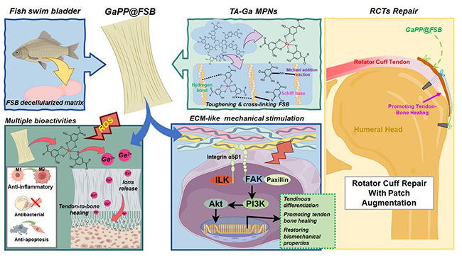 肩袖肌腱撕裂(RCTs)是一种常见的运动损伤,会导致剧烈疼痛和肩部功能障碍,如何增强RCTs术后的腱骨愈合是一个难题。陶然教授团队基于此提出,天然鱼鳔呈现出定向排列的纳米纤维结构,与天然肌腱高度相似,也许是可实现肩袖修复的新型仿生策略。经研究发现,鱼鳔经脱细胞、金属多酚网络络合后,表现出了强大的力学性质。该新型材料因其特殊的定向纳米纤维结构,可激活细胞外基质机械信号——PI3K/AKT转导,调节肌腱干细胞的成肌腱分化。在RCTs动物模型中,该补片显著促进了纤维软骨层再生、肩袖力耦平衡以及肩关节运动功能的恢复。此项工作提出的策略,即基于天然材料的微纳仿生系统——机械信号转导的思路,为RCTs等关节损伤的治疗提供了一种兼顾强大力学性能以及生物活性的新型方案,具有重要的科学意义和临床转化潜力。