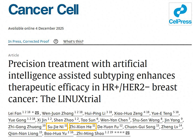 近日,由复旦大学附属肿瘤医院牵头、国内多家顶尖医疗机构共同参与的大型前瞻性临床研究——LINUX研究(NCT05594095)取得突破性成果,并在国际顶级期刊《Cancer Cell》(IF 44.5)发表。我院凭借在乳腺癌领域的深厚积淀与临床研究优势,受邀加入由复旦大学附属肿瘤医院发起的BCTOP协作组(中国乳腺癌精准治疗协作网络),承担了病例入组、数据采集、多学科协作及方案执行等关键任务,为研究的顺利开展提供了坚实支撑。充分彰显了我院在国内先进临床研究网络中的积极作为与协作实力。 聚焦临床痛点 投身国家级精准诊疗攻关 管腔型乳腺癌占全部乳腺癌病例的约2/3,其晚期一线标准治疗为内分泌治疗联合CDK4/6抑制剂,虽可延长患者无进展生存期至2~2.5年,但耐药后缺乏高效方案,后续治疗中位无进展生存期不足6个月,成为临床亟待破解的难题。针对这一重大需求,LINUX研究以“SNF复旦分型+人工智能辅助”为核心技术路径,旨在通过多组学驱动的精准分型,为CDK4/6抑制剂耐药患者匹配个体化靶向方案,重塑治疗格局。 LINUX研究的核心创新在于SNF复旦分型与数字病理AI模型的结合应用。复旦团队通过多组学数据(基因组、代谢组、蛋白质组)与相似性网络融合算法,将管腔型乳腺癌细分为SNF1(经典管腔型)、SNF2(免疫原型)、SNF3(增殖型)、SNF4(RTK驱动型)四型,并在国际数据库中验证了分型的普适性。为降低多组学检测的临床门槛,研究团队进一步开发基于病理全切片图像的AI分类模型,通过卷积神经网络自动识别SNF分型,交叉验证曲线下面积达0.78~0.87,实现了精准分型的高效、低成本落地。 我院乳腺中心积极参与患者招募与入组,完成数例乳腺癌患者的病理图像采集与智能分型,为入组的晚期乳腺癌患者实施“分型指导下的靶向治疗”方案,切实推动了前沿技术在临床的转化应用。 LINUX研究结果显示:精准治疗组客观缓解率显著高于对照组,其中SNF2(免疫原型)与SNF4(RTK驱动型)患者获益最为突出——SNF2组客观缓解率达65%(对照组30%),SNF4组达70%(对照组20%);各组3~4级治疗相关不良事件发生率均为37%,精准治疗未增加额外毒性风险。这一成果不仅验证了“AI驱动分型指导精准治疗”在晚期乳腺癌中的优效性,更标志着我国在乳腺癌精准诊疗领域迈入国际前列。我院的参与,不仅为研究贡献了高质量的病例数据与临床经验,更通过与国内顶尖团队的协作,提升了自身在多中心研究设计、数据质控及多学科协作方面的能力。 深化合作 共绘精准医学新图景 基于LINUX研究的突破性成果,后续III期多中心试验已启动筹备,我院乳腺中心将继续参与其中,并助力推动精准治疗平台的标准化建设。科室将以更开放的姿态融入国内临床研究网络,在乳腺肿瘤疾病领域深化协作,加速科研成果向临床转化,为区域患者提供更优质、更精准的医疗服务。