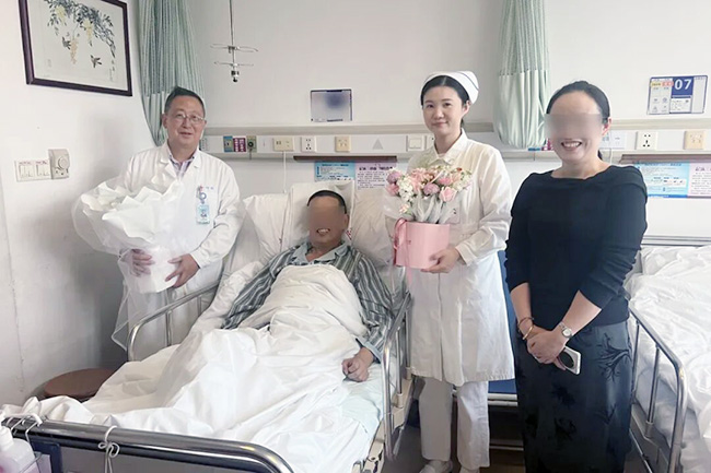 “当时陈主任告诉我们可能是肿瘤破了,我们脑子一片空白,又害怕又担心。”冯大爷的女儿回忆,“但陈主任非常果断,讲解也很清晰,让我们觉得有他在,心里就踏实,真的是事半功倍。”在医护团队的精心照护下,冯大爷术后一周便顺利出院,出院前冯女士特地送来了锦旗和鲜花表示感谢。
