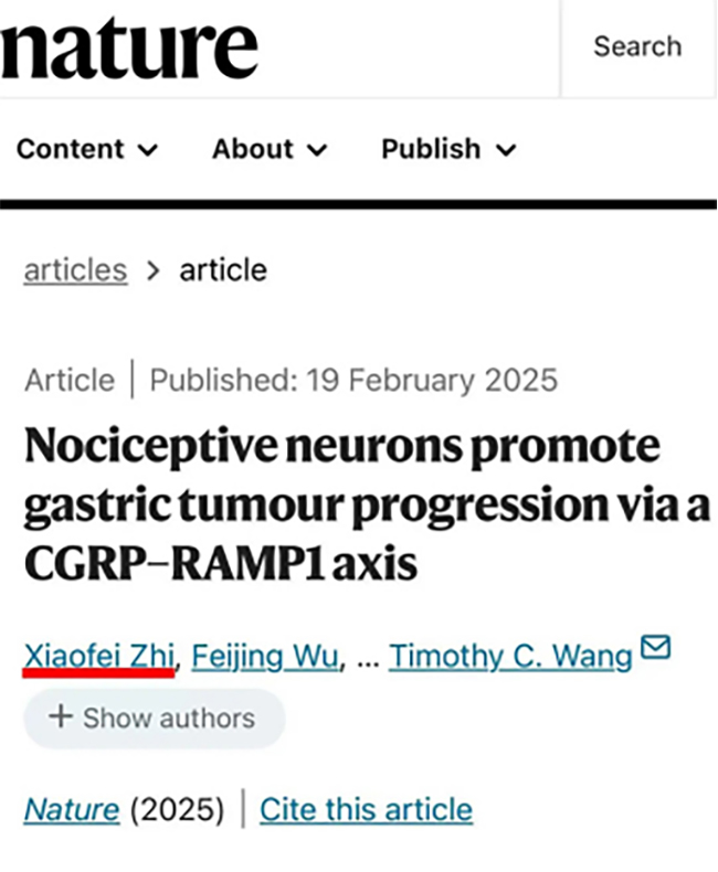 胃肠外科的支小飞教授团队在世界顶级期刊《Nature》上发表题为《Nociceptive neurons promote gastric tumour progression via a CGRP–RAMP1 axis》(感觉神经元通过CGRP-RAMP1轴促进胃癌进展)的研究论文。这是南通大学、南通地区首次以唯一第一作者在CNS正刊上发表高质量研究型论文,标志着医院基础研究水平达到国际前沿。