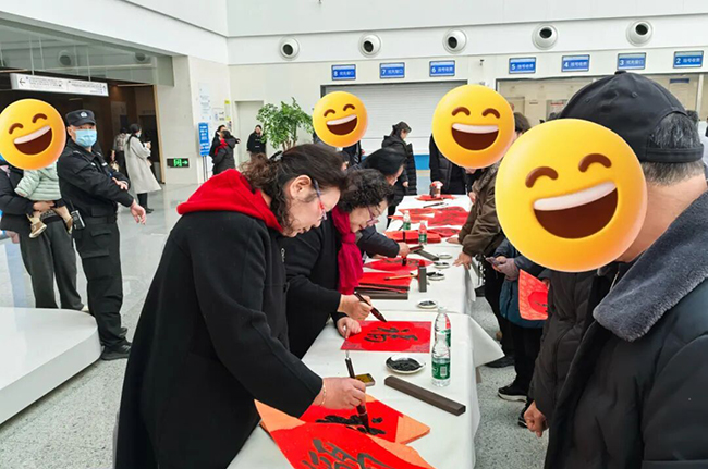 随后,新春送福环节同步在我院东院区、西院区门诊一楼大厅开启。南通知名书法家、老干部党校书法志愿者及全国先进工作者、我院黄中伟教授现场挥毫泼墨,红纸铺展,笔墨飘香,一个个饱含祝福的“福”字跃然纸上,将新春的美好祝愿与无偿献血的公益理念融入笔墨之中。来院患者及家属、广大市民纷纷驻足,领取饱含心意的春联和福字,在 墨香中感受浓浓的年味,也对无偿献血这一公益事业有了更深刻的认识。