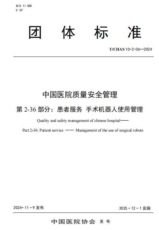 此次牵头制定的国家团体标准正式出台,不仅彰显了医院在微创外科与医疗管理领域的专业影响力与权威性,更为全国各级医疗机构手术机器人的规范化应用提供了可复制、可评价的“通大方案”,为推动我国手术机器人行业的健康发展贡献了重要力量。这也是继史加海教授牵头获批国家级限制类技术“人工智能辅助治疗技术”后的又一次重大突破。该标准编号T/CHAS 10-2-36—2024,2024年11月9日发布,2025年12月1日起正式实施。