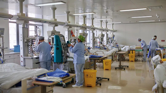 呼吸与危重症医学科床位已满又加床,入住的都是危重症病人:呼吸衰竭、慢阻肺、大咯血……还有很多急诊收来的高龄危重症患者。交接班、调整呼吸机参数、翻身拍背排痰,医护人员紧绷的神经一刻也不松懈。