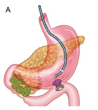 您可以把EUS-GE想象成一次“体内搭桥工程”:医生在超声胃镜的精准引导下,找到胃与空肠贴得最近的位置。通过一根细针穿刺,在胃壁与肠壁之间“打通”一个通道。放入一枚两端带“蘑菇头”的支架,像一座小桥,将胃和肠紧密连接。