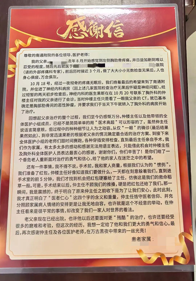近日,一封饱含真情的感谢信送至我院党委宣传部。患者家属以质朴文字,讲述了父亲李老伯在胸外科副主任、主任医师仲楼团队救治下,摆脱数月剧痛、重获健康希望的经历,字里行间满是对医护人员精湛医术与高尚医德的动容与敬意。