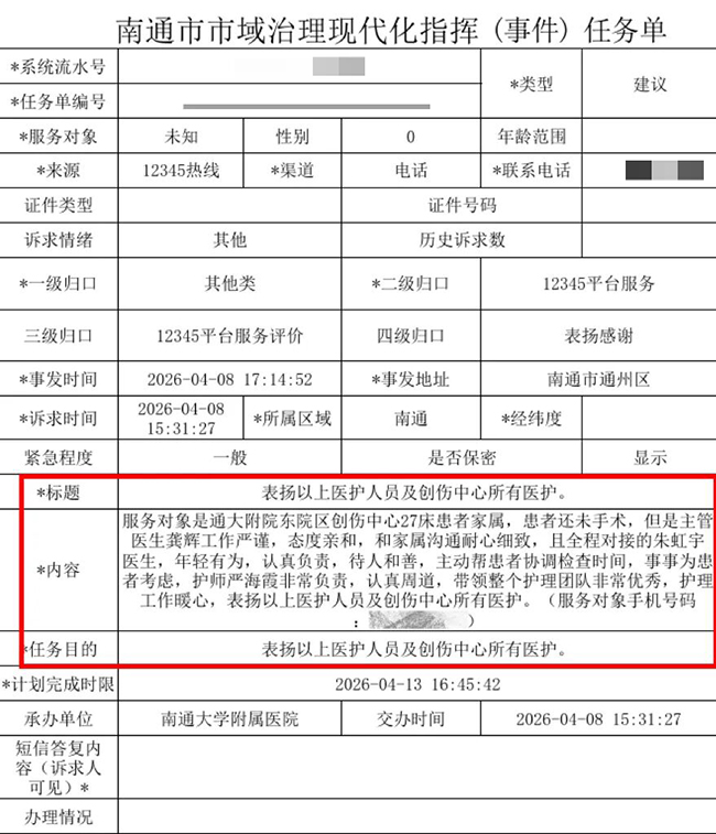 不久前,通大附院创伤中心收到了一份来自12345政务服务热线的表扬工单。工单上,一位患者家属用朴实的语言,点名表扬创伤中心主任医师龚辉及其团队,以及青年医师朱虹宇。