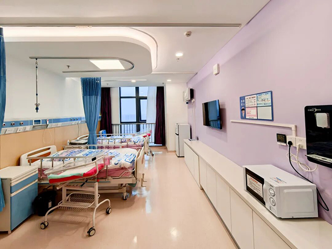 走进东院区7号楼10层,扑面而来的是柔和的紫色调——从墙面到床品,处处透着“紫气东来”的美好寓意。这里就是刚刚启用的家庭化产科,一共17张床位(12个单间+1个套间+2个双人间),无论顺产还是剖宫产,都可以预约入住。