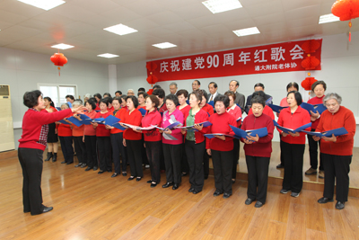4月21日下午,我院老体协文艺积极分子与部分离退休老同志欢聚一堂,共同参加了“庆祝建党90周年”红歌演唱会,大家载歌载舞庆祝党的90华诞。院党委副书记、纪委书记杨昱华观看演出并致辞。 红歌会上,老同志们以独唱、二重唱、合唱及戏曲、歌伴舞等多种形式,演唱了《五星红旗》、《我和我的祖国》、《长江之歌》、《红梅赞》等红色歌曲,表演的《太极功夫扇》展现了老同志们健康向上的风貌,最后全场合唱《没有共产党就没有新中国》更是把红歌演唱会推向了高潮。此次庆祝建党90周年红歌演唱会,抒发了我院老同志对党的感情,丰富了离退休老同志的业余文化生活。陆秀凤