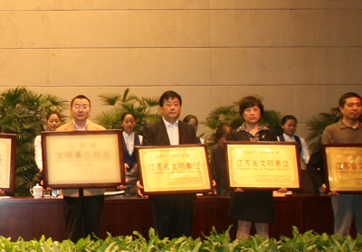 在近日召开的南通市巩固提升全国文明城市水平推进大会上,举行了江苏省文明村镇等荣誉的授牌仪式,我院陆少林院长作为江苏省文明单位的代表上台接受市领导授予的牌匾。去年年底,江苏省委、省政府命名表彰了一批2007—2009年度江苏省文明村镇、文明单位、文明社区等,我院继荣膺2005—2006年度江苏省文明单位称号后,再次蝉联此项殊荣。