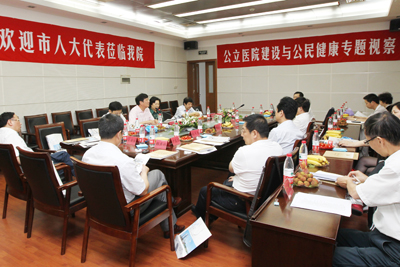 6月14日下午,部分市人大代表在市人大常委会副主任吴晓春、市人大常委会秘书长江治学的带领下,到我院作“公立医院建设与公民健康”专题视察。 陆少林院长代表医院欢迎市人大代表前来视察,并向长期以来关心支持医院建设发展的市人大代表表示感谢。院党委张涛书记从医院落实社会责任履行公共服务职能、加强医疗质量管理,提升医疗服务水平、加强经济管理,严格成本核算、加强人力资源管理,调动职工积极性、加强领导班子建设和党风廉政建设等方面,向与会人大代表进行了介绍。视察中人大代表们从公立医院履行公益职责、如何改善医患关系、优化周边环境解决停车难等方面提出了宝贵意见和建议。 市人大代表一行在张涛书记的陪同下深入到特需病房、家庭化产房、重症监护病房等医疗区域及中央监控室、地下立体车库进行了实地视察,我院一流的设施、温馨的环境、人性化的服务赢得人大代表的赞誉。市人大常委会副主任、我院副院长刘璠及相关职能部门负责人陪同视察。傅 轩