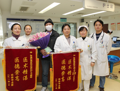 【镜头回放】 2009年8月12日中午,32岁的患者王亚宾到达通大附院急诊室,他面如纸灰、神志不清,整个人似乎浸在血泊中。医生检查发现他已经失血10000多毫升,而鲜血仍在一刻不停地向外流淌。消化内科倪润洲主任当机立断,必须马上DSA介入治疗查清出血部位,再进行外科手术止血。生命丝毫不能耽误,介入科朱小庆副主任医师,正在回家的路上,仅5分钟时间,他就到达急诊室。很快,医务处倪松石主任、王华副主任都到现场协调指挥抢救工作。介入小组凭借丰富的经验、娴熟的技术,半小时就完成了病灶的定位。普外科手术组用了一小时将患者腹部动脉血管瘤切除,大出血止住了。 术后的王亚宾被安全护送至重症监护病房,由于低蛋白血症,患者全身高度水肿,在白蛋白十分紧缺的情况下,院部特批100克白蛋白支持治疗。赵宏胜主任根据病情及时调整治疗方案,护理组人员密切监测,细致护理。术后三天,呼吸机撤除了,气管插管也拔掉了,王亚宾的面孔恢复了往日的年轻帅气。 【王亚宾妻子】 王亚宾到医院抢救的时间正是医生们的下班时间,医院急诊科、消化科、介入科、普外科、检验科等等,甚至电梯间10多个部门一路绿灯。为了抢时间,医师们顾不上喝点水,顾不上吃口饭。当时由于十分担忧,我都没注意恩人们是谁。通大附院就是我们的再生父母,我们全家会怀着感恩的心,在南通努力地工作、幸福地生活。 【王亚宾】 2009年,我突发疾病快要死的时候,是附院各科室全力抢救,让我得到了重生,现在我已完全康复,正常工作。在此非常感谢附院的医生、护士,也祝愿附院越来越好,成为全国有名的大医院。
