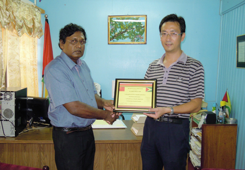 1月5日上午,圭亚那林登医院CEO Farouk Riyasat向我院派出的援圭医疗队颁发荣誉证书,表彰他们对林登医院所作出的贡献。这也是林登医院第一次给外国医疗队颁发荣誉证书。 2010年6月,我院派出由陈锦鹏、王晨毅、顾健辉、秦毅彬四名专家组成的医疗队奔赴圭亚那进行为期两年的援外医疗服务。抵圭亚那以来,他们精湛的业务素质以及团结协作、严谨认真的工作作风赢得了林登医院员工以及广大患者的高度赞誉。沧 海