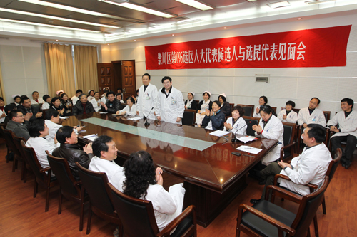 2月22日下午,我院在影像楼四楼会议室举行崇川区095选区人大代表候选人与选民代表见面会。被我选区推荐为区人大代表候选人的是我院关节外科副主任王友华、消化内科副主任周国雄,全院各方面60多名选民代表参加了见面会。 见面会由党办主任徐菊华主持,党办副主任夏玲首先向选民代表介绍了两名候选人的产生过程,并宣读了区人大关于召开代表候选人与选民代表见面会的相关要求。王友华、周国雄作为崇川区095选区人大代表候选人,分别就自己的基本情况及当选代表后的打算进行了陈述发言。见面会上选民代表还分别向两位候选人就如何结合本职工作,代表医院选民履行人大代表职责及公开自己的电子邮箱、手机号码,方便选民联系进行了提问和建议,两位候选人认真回答了选民代表的提问,并公开了自己的电子邮箱和手机号码。 见面会上,选区选举工作领导组组长、院党委书记张涛要求两位候选人不管是谁最终当选,都要兑现承诺,积极参政议政,行使好权利,反映群众呼声,很好地完成这一政治任务。针对我选区下一步的选举工作,张书记要求各党总支、直属党支部、各科室及选民小组做好选举工作的组织安排,确保选举的参选率。他要求与会的工作人员都要履行好职责,认真做好选举的各项具体工作,确保选举工作圆满完成。傅 轩