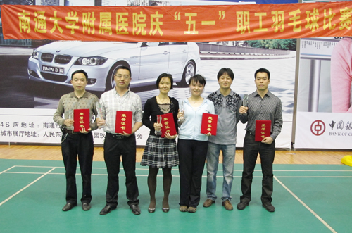 为庆祝“五一”国际劳动节,丰富广大职工的业余文化生活,增进我院羽毛球爱好者的交流和友谊,4月28日下午,院工会联合职工羽毛球协会在爱玛会体育馆举行庆“五一”职工羽毛球比赛,全院近50名选手参加了比赛。 本次比赛以片工会为单位组织,以团体形式举行,设男双、女双、混双三个项目。比赛中,选手们本着“友谊第一,比赛第二”的风格,充分发挥自身球技,他们的球技和默契配合不时赢得阵阵喝彩声,整场比赛气氛活跃。经过激烈角逐,门诊片工会荣获团体一等奖,行政片工会、后勤片工会荣获团体二等奖,内科片工会、外科片工会、综合片工会荣获三等奖。丁 霞