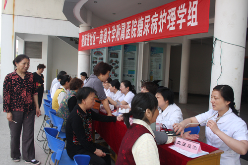 5月5日上午,在第100个“5.12国际护士节”来临之际,通大附院糖尿病护理专业学组的护理专家们又一次来到朝晖社区,为糖尿病病友提供健康指导、免费测血糖、量血压、发放健康教育资料。 闻讯赶来的近200名糖尿病病友参加了此次活动,其中年龄最大的80岁。曾经住院的李阿姨看到护理专家到社区来,连说:很高兴能在家门口看到你们,谢谢你们送健康给我们;糖尿病友姚叔叔已患糖尿病2年多了,十分担心并发症的发生,心理咨询师及糖尿病专科护士给予了心理辅导,让姚叔叔明白通过改善生活方式,Ⅱ型糖尿病是可以延缓并发症的发生或能够彻底预防的;一位路过的王阿姨看到我们的活动,停下来测量随机血糖:23.3mmol/L,学组成员立即予以疾病指导,并和医院取得联系迅速进行进一步检查。 直到我们活动结束时,仍陆续有糖尿病病友赶来咨询,看到他们一个个对糖尿病知识的渴求,更坚信了我们传播了健康理念的责任和使命。此次活动,不仅向大家送去免费服务,而且让更多的人了解糖尿病,重视糖尿病,正确对待糖尿病。我们将一如既往地定期举办讲座、疾病咨询、门诊和病房的一体化服务,做精专科护理,让全市糖尿病友得到最好的优质服务,坚定地树立战胜糖魔的信心。吴爱娟 张晓义