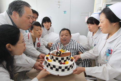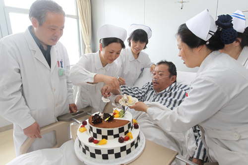 沈光辉是市区某企业员工,他于2003年5月30在我院实施了心脏移植手术,康复出院后医护人员定期回访,医患双方结下了深深的友谊。上周他因心功能不全入住心血管内科监护病房,病区医护人员得知9年前的5月30日沈光辉实施了手术,就悄悄买来蛋糕,并在蛋糕上竖起9根蜡烛,一起为他庆祝这特殊的“生日”。