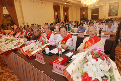 6月22日下午,南通市卫生局和市医师协会举行的市第二届医师节暨“医师终身荣誉奖”表彰大会隆重召开。16位德高望重、医术精湛的医学专家获得“医师终身荣誉奖”,我院7位专家获此殊荣,他们是:陈玉泉、侍德、钱桐荪、孟宪镛、杨锦媛、陈荫椿、刘道坤。市领导王德忠、章树山、张小平、杨展里以及南通大学党委书记顾晓松、我院院长陆少林及卫生局局长蒋志群等共同为获奖者颁奖。 颁奖现场通过播放短片的形式,向人们介绍了老专家的从医经历,通过重温那一幕幕感人肺腑的场景,回味那一个个震撼人心的瞬间,现场观众被深深感染。大家用热烈的掌声表达对获奖专家的崇敬之情。 “医师终身荣誉奖”表彰大会的召开,旨在弘扬矢志不渝、救死扶伤、爱岗敬业、薪火相传精神,引导广大医务工作者全心全意为人民健康服务,积极投身医药卫生体制改革,努力实现“服务好、质量好、医德好,群众满意”的目标。获得“医师终身荣誉奖”的老专家年龄都在80岁以上、从医60年,他们都是各医疗领域相关方面的权威,为医疗卫生事业作出了重大贡献。表彰大会上,老专家身披红绶带,精神矍铄。 85岁高龄的普外科泰斗陈玉泉步履矫健、容光焕发,他是南通医疗界有名的“不老松”,领奖台上,他用一首小诗概括自己的获奖心情:年逾八旬获殊荣,心潮涌动情难平,回首向来从医路,点滴成就浴党恩。曾获得中国显微外科杰出贡献奖的骨科教授侍徳寄语青年医师6个字:勤奋、踏实、进取。我国肾脏病学专业的创始人之一钱桐荪教授将他的座右铭与在场医务人员共勉:勤奋学习,独立思考;勇于改革,敢于创新。从医执教60载的杏林伉俪孟宪镛和杨锦媛教授,是南通唯有的享受国务院特殊津贴的夫妇专家,他们在临床工作中携手创造了一个又一个奇迹,在生活中相濡以沫、互相支持,在二人发表感言的过程中,雷鸣般的掌声一次次响起。胸外科教授陈荫椿说,他的心情无比激动,就像宇航员进入了太空舱,在这端午时节,陈教授用屈原的名言结束他的感言:路漫漫其修远兮,吾将上下而求索。在场观众对老专家与时俱进、睿智诙谐的发言报以热烈的掌声和欢乐的笑声。脑外科专家刘道坤教授正在美国探亲,他的学生、我院神经外科主任陈建转达了刘教授的感谢并代其领奖。傅 轩