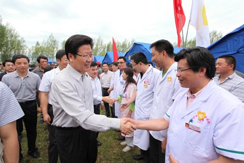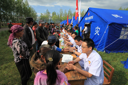 2012年6月30日,新疆自治区伊犁州新源县发生了6.6级地震,时值我院援疆专家一年半援助期满即将返程。面对突如其来的灾情,他们放下行囊,积极主动投身到地震灾区的救治和灾后防疫工作中。在江苏省援疆前方指挥部顾帮朝副局长带领下,我院援伊犁州新华医院的三位专家沈永岱、杨柳、朱建炜与州友谊医院、州中医院、州妇幼保健院等医院的江苏卫生援疆专家和新源县的5名援疆专家驱车4小时奔赴抗震救灾第一线,参与抗震救治工作。 7月2日一早,他们在新源那拉提镇茵塔勒村灾民集中安置点开展大型义诊咨询活动,闷热的帐篷里挤满了前来诊治的灾民,我院援疆专家耐心细致地为各族群众进行诊疗,他们为地震后的外伤患者进行对症处理,对一些非地震引起的疾患仔细检查,给予健康指导,并发放药品,还为当地群众进行灾后心理疏导,受到广大灾区群众的热烈欢迎。 在义诊过程中,新疆自治区党委书记张春贤来到现场视察,接见了援疆专家并与他们亲切交谈,称赞他们是苏伊人民和民族团结的使者。7月3日下午,张春贤书记在新源县听取自治州抗震救灾工作汇报时,再次对卫生援疆专家的奉献精神给予了高度肯定,他说:“江苏援疆白衣天使到了返乡时间,已经打好背包,看到发生地震,主动奔赴灾区,投入到抗震救灾工作中,用实际行动谱写了一支动人的民族团结赞歌。”傅 轩