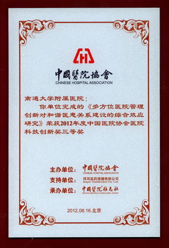 近日,我院张涛教授所率领的团队,历经数年所进行的“多方位医院管理创新对和谐医患关系建设的综合效应研究”荣获“全国医院科技创新奖三等奖”,这是我院首次获此殊荣。中国医院协会医院科技创新奖是为了鼓励医院管理者进行医院管理实践探索和理论创新、促进我国医院管理水平提高而设立的医院管理领域的最高科技奖项。今年共产生一等奖2项,二等奖3项,三等奖20项。颁奖大会在北京国家会议中心举行,全国人大原副委员长何鲁丽、卫生部部长陈竺出席颁奖大会,我院张涛、仇永贵前往领奖。 该成果针对当前国内医患关系不够和谐的现状,采用了以文化引领的人文管理、再造流程的业务管理和医法结合的纠纷管理模式,对构建和谐医患关系的作用进行了多方位的理论研究,建构了医院管理新模式并应用到医院管理实践中,取得明显效果。该研究独辟蹊径,在构建医患和谐的认识与实践上处领先地位,同时,该成果对全社会的公民道德建设与和谐社会建设也是重要补充与完善,对解决现实问题有建设性贡献,操作性与指导性强,具有重要的学术与应用价值。该成果发表论文近百篇,其中在国内权威核心期刊发表的数十篇学术论文他引率高,推广应用效果好。在此之前,该成果已获得江苏省医学会评定的2012年度江苏省医学科技奖。该成果的学术团队成员为张涛、仇永贵、顾艳荭、施琳玲、徐菊华、丁敏、王小荣、倪健辉、沙震宇。姚登福 徐水珠